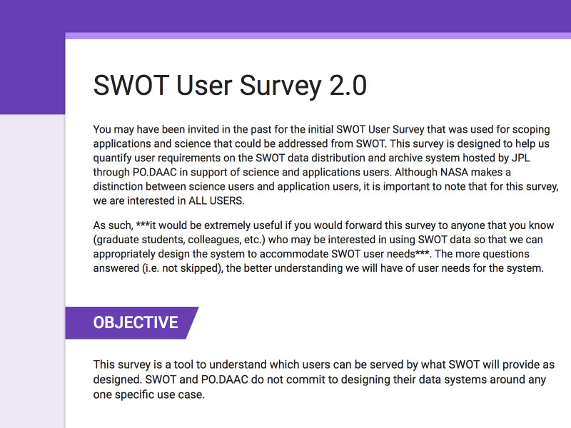 SWOT will provide high spatial resolution sea surface heights and water height measurements of large rivers and lakes. This survey is designed to help quantify user requirements on the SWOT data distribution and archive system hosted by JPL through PO.DAAC in support of science and applications users. If you are interested in using SWOT data please fill out the survey to help design the data distribution system.